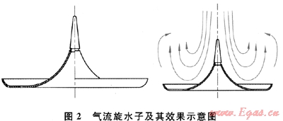 1) 采用創(chuàng)新設(shè)計的傘形氣流旋水子部件,其結(jié)構(gòu)及效果示意圖如圖2所示,以達到煙氣含濕的目的,從而保證上盤管受熱面的安全運行,強化傳熱。該技術(shù)方案的優(yōu)點在于:①當(dāng)高溫?zé)煔馀c水大面積接觸時發(fā)生了熱質(zhì)交換,加熱并部分蒸發(fā)了水,適當(dāng)降低了煙溫,使流經(jīng)上盤管受熱面的煙氣溫度不致過高,能夠控制在天然氣燃點溫度650℃以下[12],從而確保加熱氣化裝置的安全運行;②因為上盤管內(nèi)的工質(zhì)是溫度很低的LNG,適當(dāng)降低的煙溫將使上盤管受熱面內(nèi)外的工質(zhì)溫差不致太大,從而避免了盤管因熱應(yīng)力損壞,也避免了必須采用優(yōu)質(zhì)鋼材而使造價上升;③帶有水滴、霧和蒸汽的濕煙氣在換熱時,發(fā)生凝結(jié)放熱,從而有效地提高了傳熱效果。該技術(shù)是原始創(chuàng)新技術(shù),因此采用該技術(shù)的LNG加熱氣化裝置是一種全新的設(shè)計。