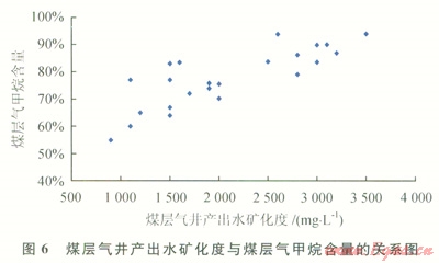 該區(qū)含氣量與礦化度呈正相關(guān)關(guān)系(2),東南部地層水礦化度小于1200mgL的區(qū)域煤層含氣量一般小于2m3t,而北部地層水礦化度大于1700mgL的區(qū)域煤層含氣量一般大于4m3t。同時,煤層氣井產(chǎn)出水礦化度與煤層甲烷含量之間相關(guān)性較好(6),煤層甲烷含量隨礦化度增加而增加,東南部煤層氣井產(chǎn)出水礦化度低于1200mgL的地區(qū),煤層甲烷含量一般低于70%,而北部煤層氣井產(chǎn)出水礦化度高于1700mgL,煤層甲烷含量一般大于80%。說明東南部距離補(bǔ)給區(qū)較近,地下水活躍,不利于煤層氣的保存,而北部遠(yuǎn)離水源補(bǔ)給區(qū),水動力處于弱徑流區(qū)一滯留區(qū),保存條件好。另外,總體上北部煤層氣井產(chǎn)氣效果也明顯好于東南部,也說明北部煤層氣富集條件優(yōu)于東南部。