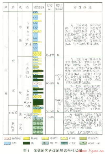 保德地區(qū)行政區(qū)劃位于山西省西北部,構(gòu)造上位于鄂爾多斯盆地東緣晉西撓曲帶北段,總體上表現(xiàn)為向西傾的單斜構(gòu)造,地層傾角介于5°l0°,斷裂構(gòu)造不甚發(fā)育[1],含煤地層為上石炭統(tǒng)一下二疊統(tǒng)太原組和下二疊統(tǒng)山西組(1)。區(qū)內(nèi)發(fā)育煤層1516層,山西組4+5號煤層和太原組8+9號煤層為主要煤層。其中,4+5號煤層單層厚度介于514.6m,平均為7.6m8+9號煤層單層厚度介于514.2m,平均為l0.2m。
