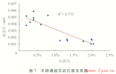 該區(qū)牛蹄塘組頁巖孔隙度為1.3%~25.6%,平均為8.24%,孔隙度中等;滲透率介于0.001~0.017mD,平均為0.008mD,滲透率極低。牛蹄塘組頁巖孔隙度與滲透率之間呈線性負(fù)相關(guān)關(guān)系,如圖7所示。