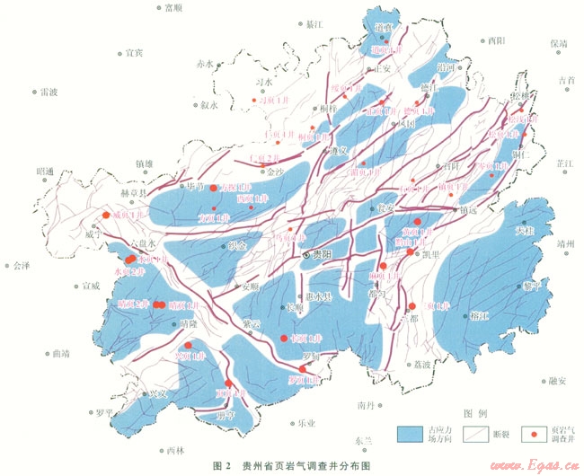 為改善能源結(jié)構(gòu),改變貴州省“無油少氣”的局面,貴州省人民政府于2012年3月開展了貴州省頁巖氣資源調(diào)查評價(jià)項(xiàng)目,針對貴州省黑色頁巖目的層,施工了27口調(diào)查井(圖2)。本文的主要數(shù)據(jù)即來源于《貴州省頁巖氣資源調(diào)查評價(jià)報(bào)告》,所公布的數(shù)據(jù)為將國內(nèi)有資質(zhì)的測試單位與國外測試機(jī)構(gòu)提供的數(shù)據(jù)比較修正后的結(jié)果。