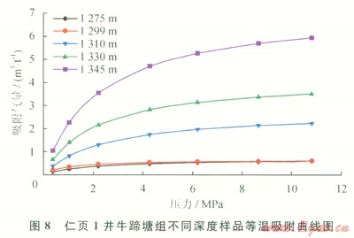 仁頁l井樣品等溫吸附實(shí)驗(yàn)共測定7個平衡壓力點(diǎn),每個壓力點(diǎn)達(dá)到平衡的時間約為12h,然后再增壓到下一個壓力點(diǎn),實(shí)驗(yàn)采用的甲烷氣濃度均大于99.999%。仁頁l井樣品等溫吸附曲線見圖8。