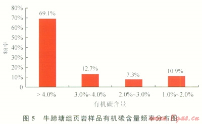 牛蹄塘組干酪根有機(jī)顯微組分以腐泥無定型和腐殖無定型為主,前者相對豐度為11%~92%,平均為49%;后者相對豐度為8%~85%,平均為48%。干酪根類型指數(shù)為51~96,干酪根類型以腐泥型和偏腐泥混合型為主。綜合分析認(rèn)為:貴州省牛蹄塘組含氣頁巖的母源主要為藻類等低等水生生物,生烴能力較強(qiáng)。通過對牛蹄塘組地表露頭和鉆孔巖心樣品的有機(jī)碳含量測試,發(fā)現(xiàn)頁巖有機(jī)碳含量范圍為0.7%~14.6%,平均為5.2%,主頻在大于4.0%的區(qū)間(圖5)。