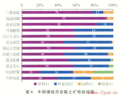 該區(qū)牛蹄塘組頁巖石英、長石等碎屑礦物含量為24%~88%,平均為72.3%;自生脆性礦物含量為0~62%,平均為8.6%;黏土礦物含量介于l2%~30%,平均為19.0%。黏土礦物以伊利石和伊蒙混層為主,綠泥石較少見(圖6)。巖石礦物學(xué)特征表明:頁巖儲層脆性礦物總體含量高,具有較好的破裂潛力,預(yù)測開發(fā)過程中可取得較好的儲層改造效果[12]。
