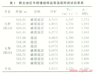 從表l可見,3件樣品有機(jī)碳含量小于1.5%,平均蘭氏體積(VL)為1.79m3/t,平均蘭氏壓力(pL)為1.32MPa;10件樣品有機(jī)碳含量大于1.5%,平均VL為3.12m3/t,平均pL為l.34MPa。綜合上述測試結(jié)果,牛蹄塘組頁巖模擬最大吸附能力平均為3.12m3/t。