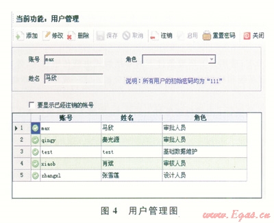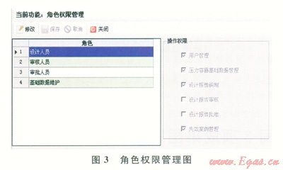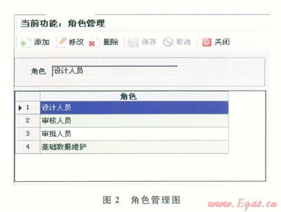 該系統(tǒng)分為角色管理、角色權(quán)限管理以及用戶管理3個(gè)部分。角色管理把使用系統(tǒng)的人員分為設(shè)計(jì)人員、審核人員、審批人員和基礎(chǔ)數(shù)據(jù)維護(hù)員(2)。這些人員能進(jìn)行的業(yè)務(wù)處理和所能查看的數(shù)據(jù)范圍各不相同,系統(tǒng)需要為每一個(gè)操作人員設(shè)立不同的賬號(hào),系統(tǒng)為每個(gè)角色分配相應(yīng)的操作權(quán)限(3)。