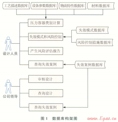 系統(tǒng)的設(shè)備工藝描述、設(shè)計(jì)參數(shù)、介質(zhì)特性、材料等基礎(chǔ)數(shù)據(jù)庫(kù)用于設(shè)計(jì)人員進(jìn)行壓力容器類別的計(jì)算,然后從失效模式數(shù)據(jù)庫(kù)、風(fēng)險(xiǎn)措施數(shù)據(jù)庫(kù)調(diào)用數(shù)據(jù)開展失效模式和風(fēng)險(xiǎn)控制判別,參照失效案例,產(chǎn)生壓力容器設(shè)計(jì)階段的風(fēng)險(xiǎn)評(píng)估報(bào)告,提交公司主管領(lǐng)導(dǎo)審核。上級(jí)公司主管領(lǐng)導(dǎo)在系統(tǒng)中進(jìn)行審核,必要時(shí)也能方便地調(diào)用失效案例數(shù)據(jù)進(jìn)行復(fù)核(1)。