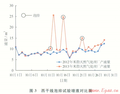 整理子洲氣田天然氣處理廠2012和2013年1—10月西干線產(chǎn)液數(shù)據(jù)進(jìn)行對比分析(圖3),泡排措施之前下游天然氣處理廠液量變化較小,增液指標(biāo)在較小幅度內(nèi)正常波動(dòng),在泡排期產(chǎn)液量均有所增加,部分時(shí)段泡排后立即見效,部分時(shí)間發(fā)生在泡排后的1~2天內(nèi),分析認(rèn)為與泡排區(qū)段內(nèi)管線的氣量波動(dòng)、積液狀況等相關(guān)。