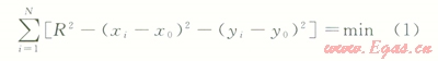 式中x0為某個(gè)下凹段管線圓心在x軸坐標(biāo)值,m;xi為某個(gè)下凹段管線第i個(gè)離散點(diǎn)在x軸坐標(biāo)值,m;y0為某個(gè)下凹段管線圓心在y軸坐標(biāo)值,m;yi為某個(gè)下凹段管線第i個(gè)離散點(diǎn)在y軸坐標(biāo)值,m。
