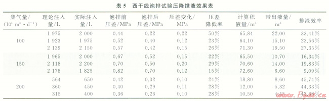 根據(jù)西干線泡排實(shí)驗(yàn)數(shù)據(jù),評(píng)價(jià)泡排前后的壓差和排液效果變化,試驗(yàn)壓降和攜液結(jié)果見表5。從表5可以看出:①隨著泡排劑的注入,輸送壓差總體呈現(xiàn)下降趨勢,如果實(shí)際注入量小于理論注入量,則導(dǎo)致降壓效果不佳;②在相同集氣量下,注入泡排劑量越大,壓降效果越顯著;③在相同的泡排劑注入量下,壓降與集氣量密切相關(guān),在100×104m3集氣量下,壓降為0.22MPa,集氣量為150×104m3時(shí),最大壓降為0.20MPa,在200×104m3集氣量下,最大壓降為0.11MPa,分析認(rèn)為集氣量大,氣流速度快,泡排劑與積液的作用時(shí)間短,進(jìn)一步優(yōu)化注入量與集氣量、注入時(shí)間及注入制度之間的關(guān)系,確保泡排劑與積液的充分作用,以進(jìn)一步提高泡排效果。