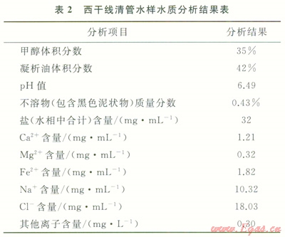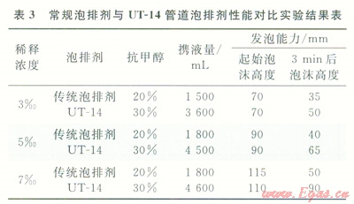 目前國內(nèi)外所使用的泡沫劑為了減少礦化度、溫度對其排液效果的影響,基本上采用陰離子表面活性劑[17],由于西干線管線積液(表2)中有大量的甲醇和凝析油,其為擴(kuò)散能力很強(qiáng)的低分子量物質(zhì),它的存在將加快泡排劑泡沫表面的排液速度,使得泡排劑產(chǎn)生的泡沫極不穩(wěn)定,很容易破滅。為此,對管線泡沫排水劑配方研究從以下兩方面進(jìn)行:①為了消除甲醇對發(fā)泡劑泡沫穩(wěn)定性的影響,對活性劑進(jìn)行篩選,選用泡沫壁相對較厚且泡沫形狀呈菱形穩(wěn)定結(jié)構(gòu)的活性劑作為泡沫排水劑的發(fā)泡成分,并且加入增溶劑,以增大活性劑在配方中的溶解度,使得配方中有效發(fā)泡成分大大增加,以消除抗凍劑對泡沫排水劑發(fā)泡、帶液能力的影響;②在發(fā)泡劑分子上引入羧基基團(tuán),讓這種網(wǎng)狀基團(tuán)阻礙或減慢甲醇這類擴(kuò)散劑分子侵入發(fā)泡劑泡沫表面,減慢或消除甲醇對發(fā)泡劑泡沫排液的影響。取西干線清管的水樣,通過系列室內(nèi)實(shí)驗(yàn),研制出管道高抗醇、抗油的管道泡排劑UT-14,3種活性劑(a:油患子精華素;b:聚乙二醇;c:三乙醇胺)的最佳配制比例為:a:b:c=10:4:1,其發(fā)泡能力(泡沫高度)達(dá)到150mm,5min后也能保持在120mm。參照泡排劑評(píng)價(jià)相關(guān)標(biāo)準(zhǔn),開展常規(guī)泡排劑與新研制泡排劑UT-14對比實(shí)驗(yàn),實(shí)驗(yàn)結(jié)果見表3,由此叮以看出,管道泡排劑UT-14抗醇、抗油能力較好,現(xiàn)場使用濃度(體積分?jǐn)?shù))為3.00‰~5.00‰,該濃度泡排劑加注后不會(huì)對下游分離沒備、管線造成影響。