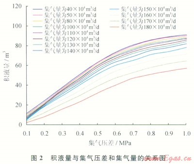 根據(jù)上述積液量計(jì)算理論,分析西干線不同集氣量下的流型、沿程的流體壓力、溫度、持液率、流速、凝析液量等的變化規(guī)律,計(jì)算給定運(yùn)行工況下管線的積液量,根據(jù)西干線最大積液量、清管數(shù)據(jù)和實(shí)際生產(chǎn)數(shù)據(jù)進(jìn)行模擬修正,得到西干線不同壓差和集氣量下的管線積液量的關(guān)系(圖2)。