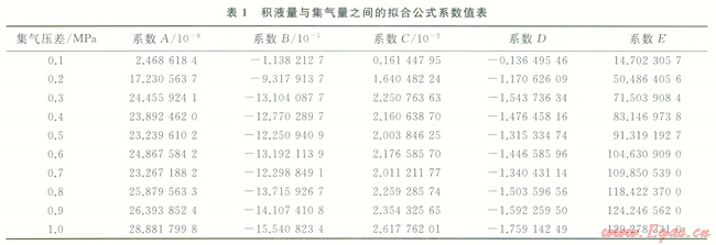 由圖2可見,給定集氣量下,集氣壓差越大,積液量越大,在相同集氣壓差下,集氣量越大,積液量越小,因?yàn)檩敋饬吭酱?,摩擦損失越大,由積液導(dǎo)致的壓損越小,根據(jù)模擬分析,擬合出積液量與集氣量和集氣壓差之間的關(guān)系式。