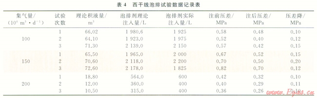 在西干線100×104m3/d、150×104m3/d、200×104m3/d不同氣量下進(jìn)行現(xiàn)場試驗(yàn),在一周期試驗(yàn)結(jié)束壓差下降后,持續(xù)生產(chǎn)一段時(shí)間管線進(jìn)出口壓差回升時(shí),繼續(xù)注入泡排劑,如此反得周期性注入,探索泡排劑作用周期,形成給定氣量下的泡排劑加注制度。試驗(yàn)前,利用上述管道積液量計(jì)算理論計(jì)算西干線給定氣量、壓差下積液量,根據(jù)泡排劑室內(nèi)實(shí)驗(yàn)的加注深度,計(jì)算出的理論注入量,實(shí)驗(yàn)參數(shù)及結(jié)果見表4.