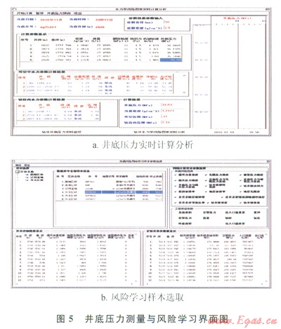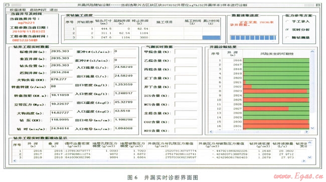 在我國(guó)某油田鉆井時(shí),應(yīng)用鉆井風(fēng)險(xiǎn)控制系統(tǒng)實(shí)時(shí)診斷鉆井狀態(tài),分別對(duì)鉆井實(shí)時(shí)數(shù)據(jù)采集軟件、鉆井實(shí)時(shí)數(shù)據(jù)庫(kù)管理軟件、鉆井風(fēng)險(xiǎn)因素實(shí)時(shí)計(jì)算分析軟件和鉆井風(fēng)險(xiǎn)推理風(fēng)險(xiǎn)軟件進(jìn)行現(xiàn)場(chǎng)測(cè)試(圖5、6)。以采集的鉆井實(shí)時(shí)數(shù)據(jù)為基礎(chǔ),應(yīng)用鉆井風(fēng)險(xiǎn)因素實(shí)時(shí)分析軟件計(jì)算井底壓力和地層壓力等參數(shù),以鄰井資料作為井漏風(fēng)險(xiǎn)學(xué)習(xí)的樣本,判斷該井井漏風(fēng)險(xiǎn),系統(tǒng)判斷該井在鉆至2823m時(shí)井漏風(fēng)險(xiǎn)可能性較大,當(dāng)鉆進(jìn)至2825m時(shí)技術(shù)人員發(fā)現(xiàn)井底發(fā)生漏失,決定進(jìn)行起鉆堵漏作業(yè)。現(xiàn)場(chǎng)測(cè)試表明鉆井風(fēng)險(xiǎn)控制系統(tǒng)的數(shù)據(jù)采集軟件與儀器測(cè)量?jī)x器同步性好,數(shù)據(jù)庫(kù)設(shè)計(jì)合理,且井漏風(fēng)險(xiǎn)實(shí)時(shí)診斷預(yù)測(cè)結(jié)果與現(xiàn)場(chǎng)完全吻合。
