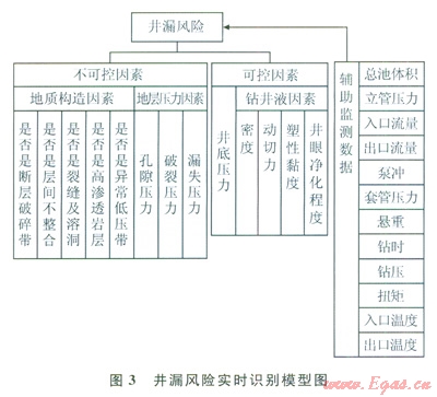 4)在研究風(fēng)險(xiǎn)推理分析理論基礎(chǔ)上建立了兩種適合于鉆井風(fēng)險(xiǎn)工程應(yīng)用的風(fēng)險(xiǎn)評(píng)估方法——基于層次分析法的模糊綜合評(píng)價(jià)法和BP神經(jīng)網(wǎng)絡(luò)識(shí)別法。這兩種方法都是將鉆井風(fēng)險(xiǎn)因素實(shí)時(shí)分析和數(shù)學(xué)推理相結(jié)合的鉆井風(fēng)險(xiǎn)評(píng)估方法,確保了鉆井風(fēng)險(xiǎn)識(shí)別分析的實(shí)時(shí)性。完成了井漏、地層流體侵入[16-17]、井塌和卡鉆的發(fā)生機(jī)理研究,總結(jié)了這4種風(fēng)險(xiǎn)發(fā)生時(shí)的表征現(xiàn)象及規(guī)律,確定了風(fēng)險(xiǎn)因素邏輯關(guān)系,并建立了其風(fēng)險(xiǎn)實(shí)時(shí)識(shí)別模型,結(jié)合鉆井風(fēng)險(xiǎn)評(píng)估方法,構(gòu)建了風(fēng)險(xiǎn)模糊綜合評(píng)價(jià)識(shí)別模型和BP神經(jīng)網(wǎng)絡(luò)識(shí)別模型。圖3為井漏風(fēng)險(xiǎn)的實(shí)時(shí)識(shí)別模型。