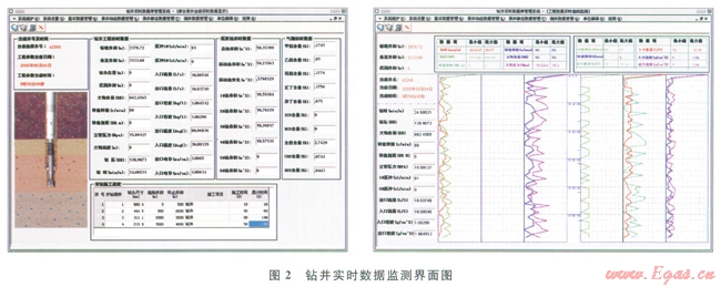 3)建立了以國(guó)際通用WITS標(biāo)準(zhǔn)為參考依據(jù)的鉆井風(fēng)險(xiǎn)控制系統(tǒng)數(shù)據(jù)庫(kù),并優(yōu)化了數(shù)據(jù)庫(kù)結(jié)構(gòu)及查詢模式,開發(fā)了鉆井風(fēng)險(xiǎn)控制系統(tǒng)實(shí)時(shí)數(shù)據(jù)庫(kù)管理軟件。軟件為用戶提供了數(shù)據(jù)庫(kù)備份、數(shù)據(jù)庫(kù)還原功能;可以瀏覽、修改、查詢、導(dǎo)出、導(dǎo)入、刪除、整理任意井的鉆井?dāng)?shù)據(jù);可以對(duì)各種數(shù)據(jù)進(jìn)行實(shí)時(shí)顯示、按時(shí)間回放、按井深回放;可以將任意數(shù)據(jù)導(dǎo)出到文本文件中;可以進(jìn)行異地備份;可以按用戶需要導(dǎo)入相關(guān)數(shù)據(jù),鉆井實(shí)時(shí)數(shù)據(jù)監(jiān)測(cè)界面如圖2所示。
