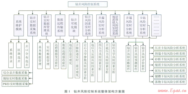 通過調(diào)研國(guó)內(nèi)外研究現(xiàn)狀,結(jié)合國(guó)內(nèi)生產(chǎn)需要,提出了一套鉆井風(fēng)險(xiǎn)控制系統(tǒng)的整體架構(gòu)方案,如圖1所示。系統(tǒng)主要包括系統(tǒng)維護(hù)模塊、實(shí)時(shí)數(shù)據(jù)采集子系統(tǒng)、實(shí)時(shí)數(shù)據(jù)庫(kù)管理子系統(tǒng)、實(shí)時(shí)數(shù)據(jù)遠(yuǎn)程傳輸子系統(tǒng)、鉆井可視化模塊、鉆井風(fēng)險(xiǎn)因素實(shí)時(shí)分析子系統(tǒng)、不同井下復(fù)雜類型實(shí)時(shí)分析子系統(tǒng)等。實(shí)時(shí)數(shù)據(jù)采集子系統(tǒng)在井場(chǎng)采集錄井儀和隨鉆工具等儀器測(cè)量的鉆井實(shí)時(shí)參數(shù),并存儲(chǔ)到數(shù)據(jù)庫(kù)中,供鉆井風(fēng)險(xiǎn)控制軟件系統(tǒng)調(diào)用、瀏覽、分析各項(xiàng)參數(shù)變化,并診斷、預(yù)測(cè)各種井下復(fù)雜情況,達(dá)到鉆井風(fēng)險(xiǎn)控制的目的。鉆井風(fēng)險(xiǎn)控制系統(tǒng)預(yù)期應(yīng)實(shí)現(xiàn)的功能包括: