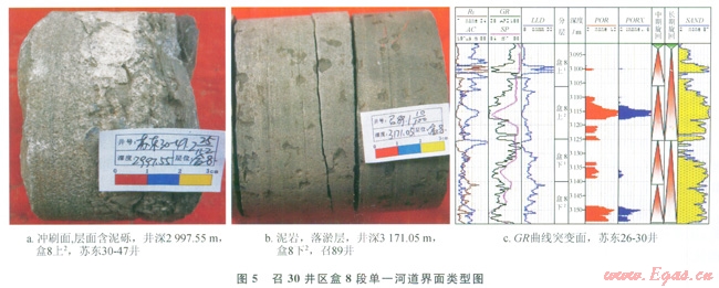 單一河道是指較長周期的大洪水期形成的具有一定分布范圍的河道單元,其識別的意義在于復合河道內(nèi)垂向上的單一河道單元的劃分,每一期次洪水的流量、流速不盡相同。因此可以依據(jù)河道內(nèi)的泥質(zhì)層、細粒沉積的發(fā)育位置、沖刷面以及測井曲線的突變來對其進行識別[20]。區(qū)內(nèi)單一河道的界面表現(xiàn)為(圖5):①沖刷面,代表洪水對前期沉積物的改造,多含泥礫;②泥巖及粉砂巖沉積,代表憩水期水體能量相對較弱時的細粒沉積,保存程度視后一期洪水能量的強弱而定;③測井曲線(GR)突變面。通過以上3種界面對召30井區(qū)盒8段短期基準面旋回內(nèi)單一河道進行識別,每個短期旋回內(nèi)均發(fā)育2~3期單一河道沉積。