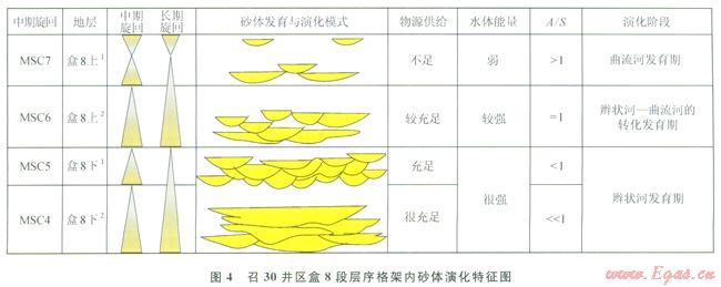 LSC2即盒8段上部層序由2個中期旋回(MSC3~MSC4)組成,底部旋回(MSC3)為向上變“深”的非對稱型,該中期旋回由2~3個(SSC7~SSC9)短期旋回組成,短期旋回由A型(向上“變深”非對稱型)向C型(對稱型)過渡,表明基準面有所抬升,可容納空間增大;頂部旋回(MSC4)為以上升半旋回為主的不完全對稱型,此時源區(qū)構(gòu)造相對穩(wěn)定,物源供給量相對減少,基準面抬升,可容納空間增大,A/S值大于1,該中期旋回由2~3個短期旋回組成(SSCl0~SSCl2)。