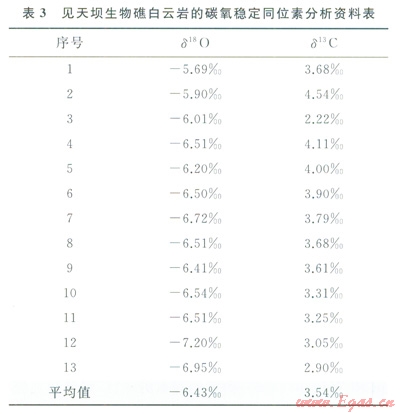 見天壩生物礁白云巖的碳氧穩(wěn)定同位素分析資料見表3??梢钥闯?,礁白云巖的穩(wěn)定同位素值(PI)B標準,下同)為d18O=5.69‰~-7.20‰;d13C=+2.22‰~+4.54‰;平均值分別是-6.43‰(d18O)和+3.54‰(d13C)。要正確了解礁白云巖的這些穩(wěn)定同位素值在白云石化作用中的含義,還需要把其放在海水的穩(wěn)定同位素值中進行對比,因為海水的穩(wěn)定同位素碳和氧值是白云石成因解釋的基礎(chǔ)(圖7)。