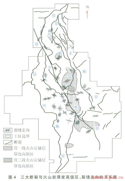 由圖4中可以看出,由徐家圍子斷陷56口井成像測井資料揭示的火山巖裂縫性儲層發(fā)育區(qū)主要受到三大斷裂的控制,其中徐中斷裂附近營城組火山巖中裂縫最發(fā)育,尤其是中南部,其次是徐西斷裂南段中部火山巖裂縫較發(fā)育;最少的是徐東斷裂附近火山巖,裂縫相對不發(fā)育。這主要是由于三條斷裂活動強(qiáng)度和性質(zhì)不同造成的,徐中斷裂不僅活動強(qiáng)烈,而且為走滑斷裂,伴隨其活動過程,附近的營城組火山巖體內(nèi)形成大量裂縫。徐西斷裂雖然活動也較強(qiáng)烈,但因不具走滑性質(zhì),活動過程中在其附近形成的裂縫數(shù)量明顯少于在徐中斷裂附近的營城組火山巖體內(nèi)形成的裂縫數(shù)量。徐東斷裂活動強(qiáng)度明顯較徐中、徐西斷裂弱,雖然其也為走滑斷裂,活動過程中在其附近的營城組火山巖體內(nèi)形成的裂縫數(shù)量也明顯較前兩者少。