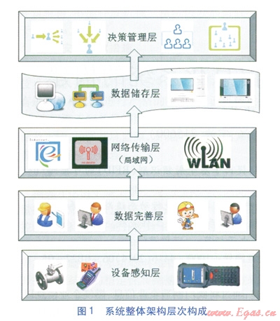 RFID可控閥門信息化系統(tǒng)整體架構(gòu)由設(shè)備感知層、數(shù)據(jù)完善層、網(wǎng)絡(luò)傳輸層、數(shù)據(jù)儲存層、決策管理層共5個層次構(gòu)成,系統(tǒng)整體架構(gòu)層次構(gòu)成見圖1