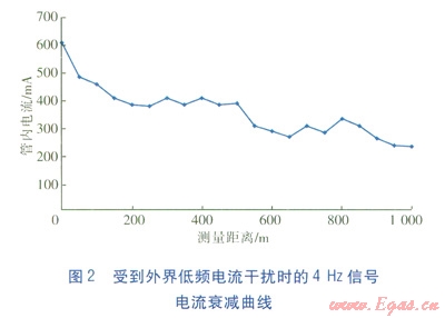 一般情況下,管道內(nèi)的信號電流應該隨著測量距離的增大而不斷衰減,但是當存在外界低頻電流干擾時,4Hz的信號電流會出現(xiàn)突然反彈或者波動的現(xiàn)象,受到外界低頻電流干擾時的4Hz信號電流衰減曲線見圖2[6]。外界干擾的低頻電流會與檢測中使用的4Hz低頻信號電流互相作用,產(chǎn)生疊加或抵消,當疊加時,會出現(xiàn)圖2中信號電流反彈升高的情況;當?shù)窒麜r,會出現(xiàn)信號電流驟然變小的情況。無論是疊加還是抵消,都會對防腐層的檢測結果產(chǎn)生很大影響,甚至嚴重失真。