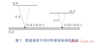 一般地,城鎮(zhèn)燃氣管道各處埋深不同。不同的管道埋深將會對防腐層破損點處泄漏電流產(chǎn)生的電場產(chǎn)生很大影響。假設管道防腐層的破損情況相同、周圍土壤電阻率變化不大,當管道埋深較小時,從防腐層破損點向外傳導的電流相對集中,在地面上檢測到的電流較大;而當管道埋深較大時,在地面上檢測到的電流較小(見圖3)。