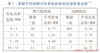 內(nèi)燃機組是將液體或氣體燃料與空氣混合后,直接輸入氣缸內(nèi)部燃燒并產(chǎn)生動力的設備,是一種將熱能轉化為機械能的熱機,具有體積小、熱效率高、啟動性能好等優(yōu)點,發(fā)電功率范圍為5~18000kW。美國不同規(guī)模分布系統(tǒng)的發(fā)電機組發(fā)電功率見表1[12]。