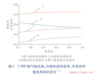 在分布系統(tǒng)中,發(fā)電機組常運行在部分負荷狀態(tài)下,其變工況特性對分布系統(tǒng)綜合性能影響較大。以發(fā)電功率均為3MW的燃氣輪機組、內(nèi)燃機組為例,熱效率、發(fā)電效率隨負荷率的變化見圖2[12]。由圖2可知,隨著負荷率的降低,兩種發(fā)電機組的發(fā)電效率均呈現(xiàn)下降趨勢,但內(nèi)燃機組的發(fā)電效率比燃氣輪機組高10%(絕對值)左右。燃氣輪機組的熱效率明顯高于內(nèi)燃機組,前者的熱效率隨著負荷率的降低而降低,后者的熱效率隨著負荷率的降低有上升趨勢。由以上分析可知,盡管兩種發(fā)電機組在額定工況下具有大致相同的熱電總效率(熱效率與發(fā)電效率之和),但內(nèi)燃機組的變工況特性更優(yōu)。