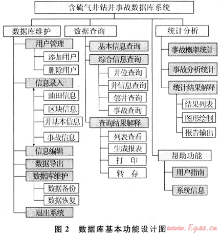 鉆井事故數(shù)據(jù)庫(kù)系統(tǒng)主要有如下5大功能模塊:①數(shù)據(jù)管理:完整的數(shù)據(jù)錄入、編輯、刪除等操作。數(shù)據(jù)庫(kù)管理設(shè)計(jì)的關(guān)鍵問(wèn)題是如何避免記錄重復(fù)添加、規(guī)范數(shù)據(jù)的輸入格式以及一定的容錯(cuò)性。a.避免記錄重復(fù),新數(shù)據(jù)與數(shù)據(jù)庫(kù)內(nèi)原有記錄不能完全相同。若新輸入的數(shù)據(jù)在數(shù)據(jù)庫(kù)中已存在給出提示。b.數(shù)據(jù)庫(kù)格式規(guī)范化,數(shù)據(jù)庫(kù)對(duì)于所輸入的數(shù)據(jù)必須經(jīng)過(guò)一定的后臺(tái)處理后,才能存儲(chǔ)到數(shù)據(jù)庫(kù)文件中。為了保證數(shù)據(jù)存儲(chǔ)的準(zhǔn)確性,該數(shù)據(jù)庫(kù)系統(tǒng)對(duì)所輸入數(shù)據(jù)的格式進(jìn)行了規(guī)定。c.容錯(cuò)性,若對(duì)每一個(gè)數(shù)據(jù)項(xiàng)都進(jìn)行嚴(yán)格的規(guī)定,這無(wú)疑會(huì)引起數(shù)據(jù)錄入人員的反感,對(duì)數(shù)據(jù)錄入人員的技術(shù)水平也提出更高的要求,有些字段沒(méi)有必要進(jìn)行嚴(yán)格的格式限制。因此,充分利用Visual Basic內(nèi)部的字符轉(zhuǎn)化程序,有些字段沒(méi)有進(jìn)行格式限制,從而保證系統(tǒng)有一定的容錯(cuò)性。d.數(shù)據(jù)的完整性,在數(shù)據(jù)編輯過(guò)程中所要考慮的首要問(wèn)題是數(shù)據(jù)庫(kù)采用關(guān)系型數(shù)據(jù)庫(kù),同一字段會(huì)在多個(gè)表中出現(xiàn),在數(shù)據(jù)的修改、刪除操作時(shí),須保證數(shù)據(jù)庫(kù)的整體完整性。②數(shù)據(jù)庫(kù)備份與恢復(fù):對(duì)現(xiàn)有的數(shù)據(jù)庫(kù)內(nèi)數(shù)據(jù)定期進(jìn)行數(shù)據(jù)備份,防止由于系統(tǒng)問(wèn)題或誤操作造成的數(shù)據(jù)丟失。a.備份文件名稱命名規(guī)則“database”+“備份的日期”(例如2008年5月29日備份的文件名:database20080529.mdb)。b.系統(tǒng)恢復(fù)功能,當(dāng)數(shù)據(jù)庫(kù)內(nèi)部數(shù)據(jù)出現(xiàn)錯(cuò)誤或者誤操作引起數(shù)據(jù)丟失時(shí),利用先前備份的數(shù)據(jù)庫(kù)文件,將數(shù)據(jù)庫(kù)恢復(fù)到指定日期。③查詢功能:數(shù)據(jù)庫(kù)的查詢功能是數(shù)據(jù)庫(kù)的核心功能,該數(shù)據(jù)庫(kù)系統(tǒng)共設(shè)計(jì)有5種查詢。a.數(shù)據(jù)導(dǎo)航式查詢,將數(shù)據(jù)庫(kù)系統(tǒng)所存儲(chǔ)數(shù)據(jù)以樹(shù)形結(jié)構(gòu)進(jìn)行顯示,以方便使用者查詢。數(shù)據(jù)導(dǎo)航式查詢采用“油氣田→區(qū)塊→井→事故”四級(jí)導(dǎo)航模式數(shù)據(jù)庫(kù)。b.區(qū)塊井位查詢,輸入?yún)^(qū)塊/井名稱查詢井位,有信息則在窗體右邊區(qū)域顯示,若沒(méi)有信息則給出數(shù)據(jù)庫(kù)中無(wú)信息的提示,在顯示區(qū)域可提前設(shè)定顯示比例。c.井的基本信息查詢,多種條件下的復(fù)合檢索,最多支持3個(gè)查詢條件。根據(jù)查詢條件的邏輯關(guān)系,在“邏輯關(guān)系”列表框中選擇“并且、或者”。d.鄰井查詢,以井口坐標(biāo)為依據(jù)查詢鄰井,可以自定義查找半徑。e.事故查詢,事故地質(zhì)、鉆井工藝、鉆井液性能、井口設(shè)備以及事故特征參數(shù)查詢。④統(tǒng)計(jì)功能,利用標(biāo)準(zhǔn)SQL語(yǔ)句可以對(duì)數(shù)據(jù)庫(kù)中的數(shù)據(jù)進(jìn)行統(tǒng)計(jì)、求和等,然后利用Visual Basic中的Ms-chart控件實(shí)現(xiàn)統(tǒng)計(jì)結(jié)果的繪圖功能。⑤數(shù)據(jù)導(dǎo)出功能:根據(jù)用戶需要將特定的信息從數(shù)據(jù)庫(kù)導(dǎo)出到word或者excel文本中。⑥自動(dòng)報(bào)表功能:根據(jù)數(shù)據(jù)庫(kù)所存數(shù)據(jù),按照油氣田標(biāo)準(zhǔn)格式打印用戶指定信息。