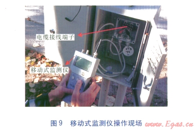 固定式監(jiān)測儀由220V電源供電,最大監(jiān)測管段長度為5km,對于長距離熱網(wǎng),應(yīng)根據(jù)監(jiān)測儀的最大監(jiān)測管段長度,將熱網(wǎng)分為若干獨立的監(jiān)測回路。固定式監(jiān)測儀置于專門設(shè)備箱內(nèi),故障信號可上傳至監(jiān)測中心,實施遠(yuǎn)距離監(jiān)測系統(tǒng)集中管理。移動式監(jiān)測儀能夠?qū)?span lang="EN-US">2~5km長度范圍內(nèi)的管段進(jìn)行監(jiān)測,可實現(xiàn)對附近沒有電源無法設(shè)置固定式監(jiān)測儀及某些分支管段的監(jiān)測。固定式監(jiān)測儀安裝現(xiàn)場、移動式監(jiān)測儀操作現(xiàn)場分別見圖8、9。