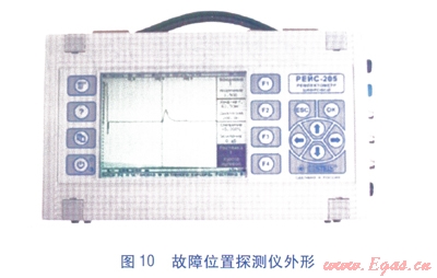 故障位置探測儀主要用于確定故障位置,一旦監(jiān)測中心接到報警信息,并確定報警固定式監(jiān)測儀具體位置,或由移動式監(jiān)測儀監(jiān)測出故障管段。操作人員攜帶故障位置探測儀,對故障管段進(jìn)行故障點定位。故障位置探測儀的監(jiān)測管段長度為2~10km,與電纜接線端子的接入方法與移動式監(jiān)測儀相同,設(shè)備外形見圖10。