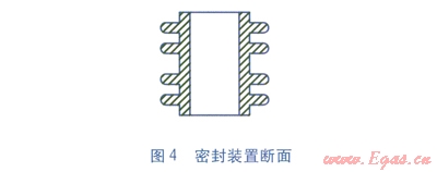 端部出線位置在保溫結(jié)束處,出線電纜采用三芯電纜接入保溫管,其中兩根導(dǎo)線分別連接兩根信號導(dǎo)線,第三根導(dǎo)線連接工作鋼管。端部出線方式分為兩種:第一種,通過安裝在保溫層堵板上的密封裝置引出,主要用于進(jìn)入建筑物內(nèi)部管道的信號電纜出線,見圖2。第二種,通過安裝在PE保護(hù)層上的密封裝置引出,主要用于建筑物外部管道的信號電纜出線,見圖3。密封裝置斷面見圖4。