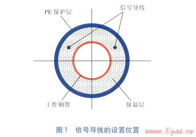 為了實現(xiàn)遠(yuǎn)距離監(jiān)測功能,在管子及管件的保溫層中內(nèi)置2根信號導(dǎo)線,截面積為1.5mm2。信號導(dǎo)線固定在PE保護(hù)層支撐塊上,并平行于工作鋼管[1],信號導(dǎo)線的設(shè)置位置見圖1。