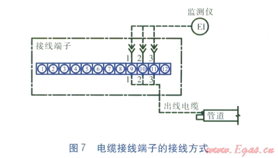 為了將監(jiān)測儀方便地接入監(jiān)測系統(tǒng),在監(jiān)測點附近沒置電纜接線端子。電纜接線端子可以方便接入監(jiān)測儀、接通或斷開出線電纜,接線方式見圖7。電纜接線端子置于專門設(shè)備箱內(nèi),根據(jù)熱網(wǎng)規(guī)模和走向需要布置若干個設(shè)備箱,并安裝在干燥及通風(fēng)良好的環(huán)境中。對于相對濕度較高的場所,應(yīng)采用密封設(shè)備箱。