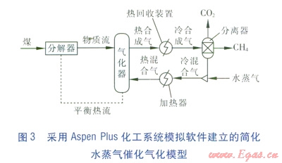 為了研究采取煤預(yù)處理工藝的水蒸氣催化氣化工藝的運(yùn)行性能,筆者采用Aspen Plus化工系統(tǒng)模擬軟件建立了簡化的水蒸氣催化氣化模型,見圖3。分解器模塊將非常規(guī)組分煤預(yù)處理轉(zhuǎn)化為以CH、O、NS組成的混合物質(zhì),而后送入氣化器在高溫高壓條件下進(jìn)行反應(yīng),反應(yīng)生成的產(chǎn)物包括CH4、CO、CO2、H2,經(jīng)過熱回收裝置降溫后在分離器中進(jìn)行分離,分離出CH4、CO2,而分離出來的CO、H2等則與水蒸氣混合,經(jīng)加熱器加熱后返回氣化器繼續(xù)進(jìn)行反應(yīng)。