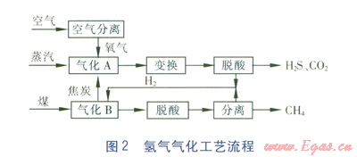 直接轉(zhuǎn)化方法主要有氫氣氣化、水蒸氣催化氣化方法。氫氣氣化方法以氫氣作為氣化劑,氫氣由焦炭—蒸汽—氧氣氣化制得(對應(yīng)氣化器A一路),煤氫氣氣化后(對應(yīng)氣化器B一路)經(jīng)脫酸得到的產(chǎn)物主要為甲烷、氫氣(過剩部分),經(jīng)分離最終得到甲烷,過剩氫氣與來自氣化器A一路的氫氣一起返回氣化器B作為煤氣化劑。氫氣氣化工藝流程見圖2。目前,l3本新能源產(chǎn)業(yè)技術(shù)綜合開發(fā)機(jī)構(gòu)(NEDO)正大力發(fā)展該項(xiàng)技術(shù),據(jù)報(bào)道氫氣氣化技術(shù)的熱效率比間接轉(zhuǎn)化方法高,造價(jià)也有望降低,從而進(jìn)一步提高SNG的競爭力[2]