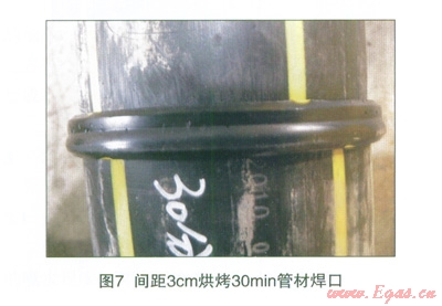 烘烤溫度要求能烘出管材端面所含水分但不能過高導(dǎo)致管材端面熔融無法焊接。水的沸騰汽化溫度是100%,聚乙烯管材的熔融溫度是190℃,ME3440,PE80,中密度聚乙烯管材的焊接溫度(加熱板的溫度)為200%~220%,管材斷面到熱板吸熱面對距離為2cm~3cm的烘烤溫度適宜。烘烤時間不能超過聚乙烯管材的氧化時間,ME3440,PE80,巾密度聚乙烯燃氣管材的210℃氧化誘導(dǎo)時間為40min左右,取烘烤時間為20min、30min來進行試驗驗證,焊接中加熱板溫度為最低焊接溫度210℃,焊接效果見圖4、圖5。