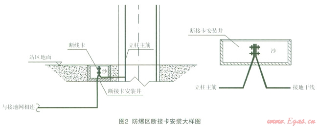 屋面避雷帶及接閃短桿均與建筑物鋼筋混凝土立柱內(nèi)主筋相焊接,鋼筋混凝土立柱內(nèi)(兩根不少于Æ16)主鋼筋做引下線(引下線采用綁扎連接),與接地網(wǎng)作可靠電氣連接。作引下線的立柱應(yīng)沿建筑物四周均勻布置,間距不得大于18m。很多設(shè)計(jì)員存距地面0.3m0.5m的立柱上設(shè)斷接卡與站內(nèi)的人工接地網(wǎng)相連接,但壓縮機(jī)間、工藝罩棚立柱周圍都處于防爆區(qū),在防爆區(qū)內(nèi)直接設(shè)置斷接卡存在很大的安全隱患,所以防爆區(qū)內(nèi)引下線斷接卡應(yīng)采用防爆接線盒安裝,并用防爆膠泥密封,或者是設(shè)置在地面上,用干沙填實(shí)。尤其是LNG場站更需注意,因?yàn)?span lang="EN-US">LNG泄漏后迅速氣化而形成的低溫氣體比重較大,會(huì)聚集在地面附近,遇到斷接卡放電時(shí)極易發(fā)生爆炸。
