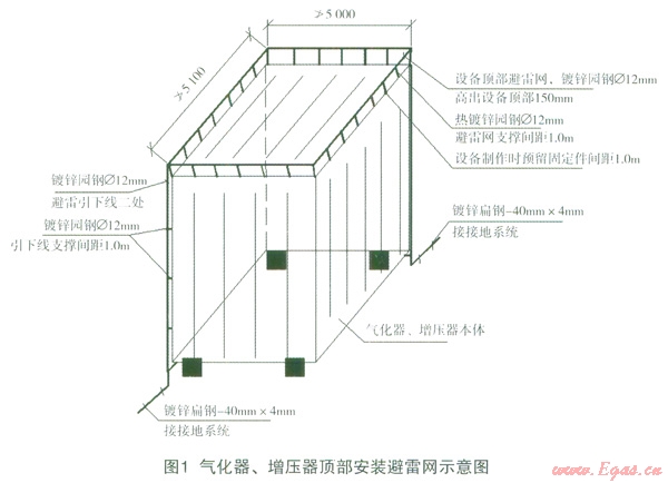 根據(jù)《建筑物防雷設(shè)計(jì)規(guī)范》GB50057—2010規(guī)定,加氣站、門站、調(diào)壓站內(nèi)的工藝罩棚、壓縮機(jī)間等工藝構(gòu)筑物均屬于2類防雷建筑物,站內(nèi)的站房、輔房屬于3類防雷建筑物。在壓縮機(jī)間犀面上用中12熱鍍鋅圓鋼敷設(shè)不大于10m×10m12m×8m的避雷網(wǎng)格,四角做接閃短桿。工藝罩棚一般為雙層彩鋼板屋面,中間為阻燃物,很多設(shè)計(jì)員認(rèn)為即使罩棚遭受雷擊,只要彩鋼板厚度大于0.5mm,閃電只會(huì)擊壞罩棚而不會(huì)危及罩棚下的工藝裝置和人員的安全,所以直接利用罩棚作接閃器。但這種思路卻忽略了對罩棚本身的防護(hù),罩棚頂部被擊壞后維修比較困難,并且罩棚被擊壞后雨水滲入會(huì)對罩棚的鋼結(jié)構(gòu)造成腐蝕,縮短罩棚的使用壽命。所以在罩棚頂部也應(yīng)用F12熱鍍鋅圓鋼布置成不大于10m×10m12m×8m的避雷網(wǎng)格,并在四角做接閃短桿。