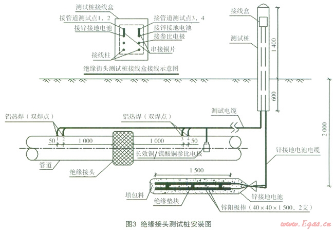 工藝專業(yè)一般都在加氣站、門站、調(diào)壓站等場站的進(jìn)出站管道上設(shè)有絕緣接頭。絕緣接頭的功能主要有兩個(gè),一是將陰極保護(hù)電流限制在站外管道上,防止陰極保護(hù)電流通過站內(nèi)工藝裝置的接地系統(tǒng)流失,二是將站內(nèi)設(shè)備的雜散電流隔絕在站內(nèi),防止雜散電流流到站外長輸管道或者城市管網(wǎng)上造成雜散電流干擾腐蝕。但絕緣接頭只能作為隔絕管道陰極保護(hù)電流及站內(nèi)雜散電流用,而不能作為過電壓的安全防護(hù)措施用,站內(nèi)及管道上因雷擊產(chǎn)生的高電壓、站內(nèi)設(shè)備故障產(chǎn)生的高電壓、管道上因氣流摩擦而產(chǎn)生的靜電、長輸管道的感應(yīng)過電壓等都會(huì)將絕緣接頭損壞。絕緣接頭一旦損壞就會(huì)對長輸管道或者城市管網(wǎng)的陰極保護(hù)系統(tǒng)造成嚴(yán)重影響,甚至使陰極保護(hù)系統(tǒng)失效,所以必須為絕緣接頭添加防護(hù)措施。絕緣接頭的防護(hù)裝置主要有避雷器、電解接地電池、極化電池及二極管保護(hù)器,目前應(yīng)用最廣泛的是接地電池。接地電池是用來提供一個(gè)低電阻通道,排放強(qiáng)電電涌但不泄漏陰極保護(hù)直流電流的一種裝置,通常采用鋅材料制作[1]。
