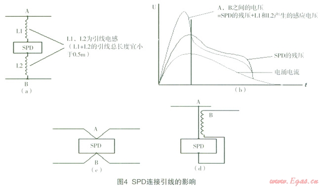 在各級(jí)配電柜/箱及信息系統(tǒng)線路上安裝相應(yīng)級(jí)別的電涌保護(hù)器(SPD),以把雷電流及電氣系統(tǒng)故障電流盡可能地泄入大地,保護(hù)用電設(shè)備的安全。為使SPD安裝處呈現(xiàn)的最大電涌電壓足夠低,SPD兩端的引線應(yīng)做到最短(兩端引線總長度不宜大于0.5m),并且要避免形成過大環(huán)路,以獲得最佳保護(hù)效果。當(dāng)引線較長而產(chǎn)生的引線寄生感應(yīng)電壓較大時(shí),可采用圖4(c)、(d)的接線,以轉(zhuǎn)移和補(bǔ)償引線的寄生電感,從而改善保護(hù)電路的性能[2]。