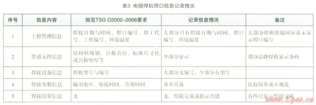 在焊口信息記錄方面,各品牌電熔焊機都具有數(shù)據(jù)檢索存儲功能,配置相應(yīng)的輸出接口(數(shù)據(jù)下載或打印接口),存儲容量高于標(biāo)準(zhǔn)和規(guī)范要求(不少于250)。但是,與全自動熱熔焊機一樣存在信息不規(guī)范或不全的問題。對于具有可追溯性的焊口信息來說,應(yīng)至少包括工程管理、管道元件信息、焊接設(shè)備信息、焊接參數(shù)信息和焊接結(jié)果信息等5個方面。如表3所示,不少焊機記錄的焊口信息過于簡單和不規(guī)范。這既與目前相關(guān)標(biāo)準(zhǔn)和規(guī)范對此要求不夠具體有關(guān),又與對焊口信息對焊接工程管理重要性認識不足有關(guān)。