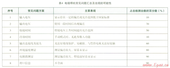 4匯總了檢測過程中發(fā)現(xiàn)的常見問題以及占總檢測臺數(shù)的百分?jǐn)?shù)。其中常見的直接影響焊接質(zhì)量的問題主要是輸出電壓和環(huán)境溫度測量,而電阻值測量與焊口信息兩方面是電熔焊機普遍存在的問題。這應(yīng)引起焊機廠家與焊接質(zhì)量管理部門的重視。