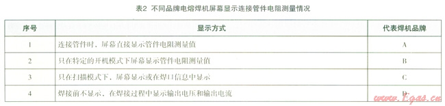 其二,各品牌焊機對連接管件電阻測量功能存在明顯的差異。一方面,表2匯總了常見品牌焊機焊接前屏幕顯示連接管件電阻測量值的情況??梢钥闯?,有砦品牌焊機在焊接前不顯示或不直接顯示,這是不滿足國家標(biāo)準(zhǔn)的要求。另一方面,當(dāng)電熔管件電阻值較小時,大部分電熔焊機的電阻測量偏差超出標(biāo)準(zhǔn)規(guī)定的測量偏差允許范同。檢測中發(fā)現(xiàn),某個焊機在連接2W管件時,焊接前屏幕顯示測量電阻值為60W。這既與焊機的電阻測量精度有關(guān),又與連接接頭的接觸電阻有關(guān)。