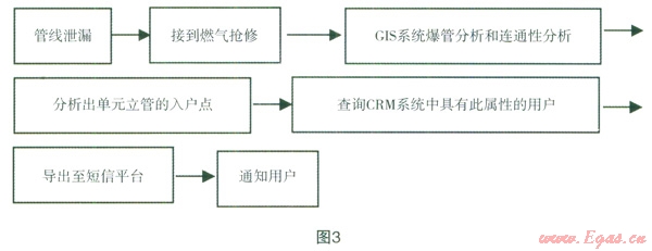 GIS系統(tǒng)中,設(shè)置單元立管的入戶點(diǎn)為最小單元;在CRM系統(tǒng)中,增加燃?xì)庥脩羲鶎賳卧⒐苋霊酎c(diǎn)的屬性;當(dāng)出現(xiàn)燃?xì)夤艿佬孤屝迒?wèn)題時(shí),可以通過(guò)GIS系統(tǒng)中的爆管分析和連通性分析,分析出泄漏點(diǎn)所影響的單元立管入戶點(diǎn),通過(guò)調(diào)用CRM系統(tǒng)中的具有此入戶點(diǎn)屬性的用戶,分析出所影響的用戶數(shù),并調(diào)用短信平臺(tái)接口將停氣通知實(shí)時(shí)發(fā)送至用戶手機(jī)中。此種方式,提高了影響范圍用戶的準(zhǔn)確性,并縮短了通知用戶的時(shí)間。具體的過(guò)程如圖3。