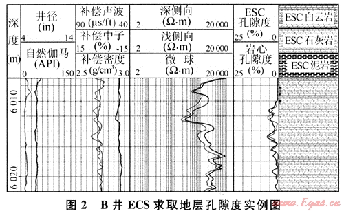 該計(jì)算方法得到的孔隙度與實(shí)測巖心孔隙度相比較,有良好的相關(guān)性。如B井,該井在6010~6020m處取心,經(jīng)過巖心分析,得出了該段的巖心分析孔隙度;按筆者提供計(jì)算孔隙度方法,用ECS資料結(jié)合常規(guī)測井密度資料,也求取了一個(gè)地層孔隙度。兩者對比,相關(guān)性較好(圖2),這充分證明了ECS計(jì)算的孔隙度的準(zhǔn)確性。