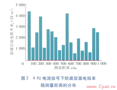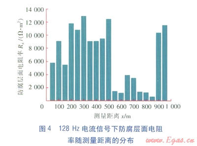 從圖34的測量結(jié)果來看,4Hz電流信號測量的結(jié)果,防腐層的質(zhì)量較差,平均面電阻率為2106W·m2128Hz電流信號測量的結(jié)果,防腐層的平均面電阻率為6926W·m2。